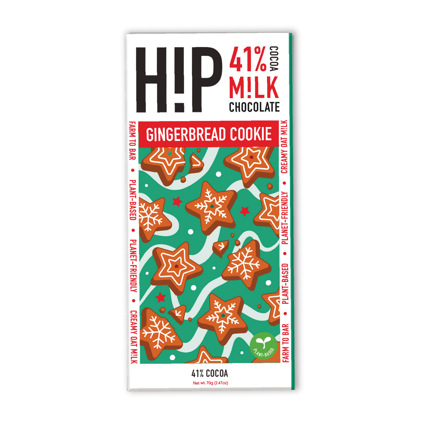 Colombian Oat M!lk Chocolate (sugar, cocoa butter, dried gluten-free OAT syrup 23%, cocoa mass, dried rice powder, emulsifier (sunflower lecithin), vanilla extract), wafer crunch 5% (WHEAT flour, sugar, coconut fat, emulsifier sunflower lecithin, caramelised sugar syrup, salt), natural gingerbread flavouring.